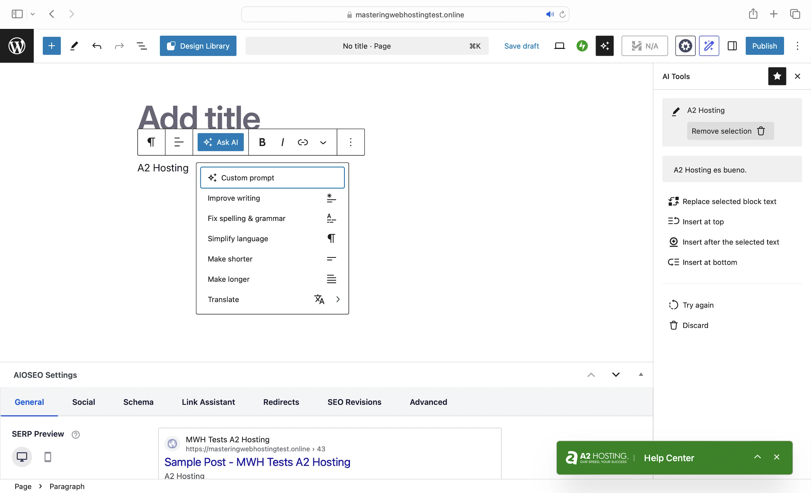 - AI writing assistant: Same tool as GreenGeeks and same results too: Not thrilled about the content generated. Again, it screamed AI slop and left out important details like LiteSpeed and the A2 Optimized plugin, which are A2 Hosting’s key speed features. Though to be fair, I might get better content with better prompts.