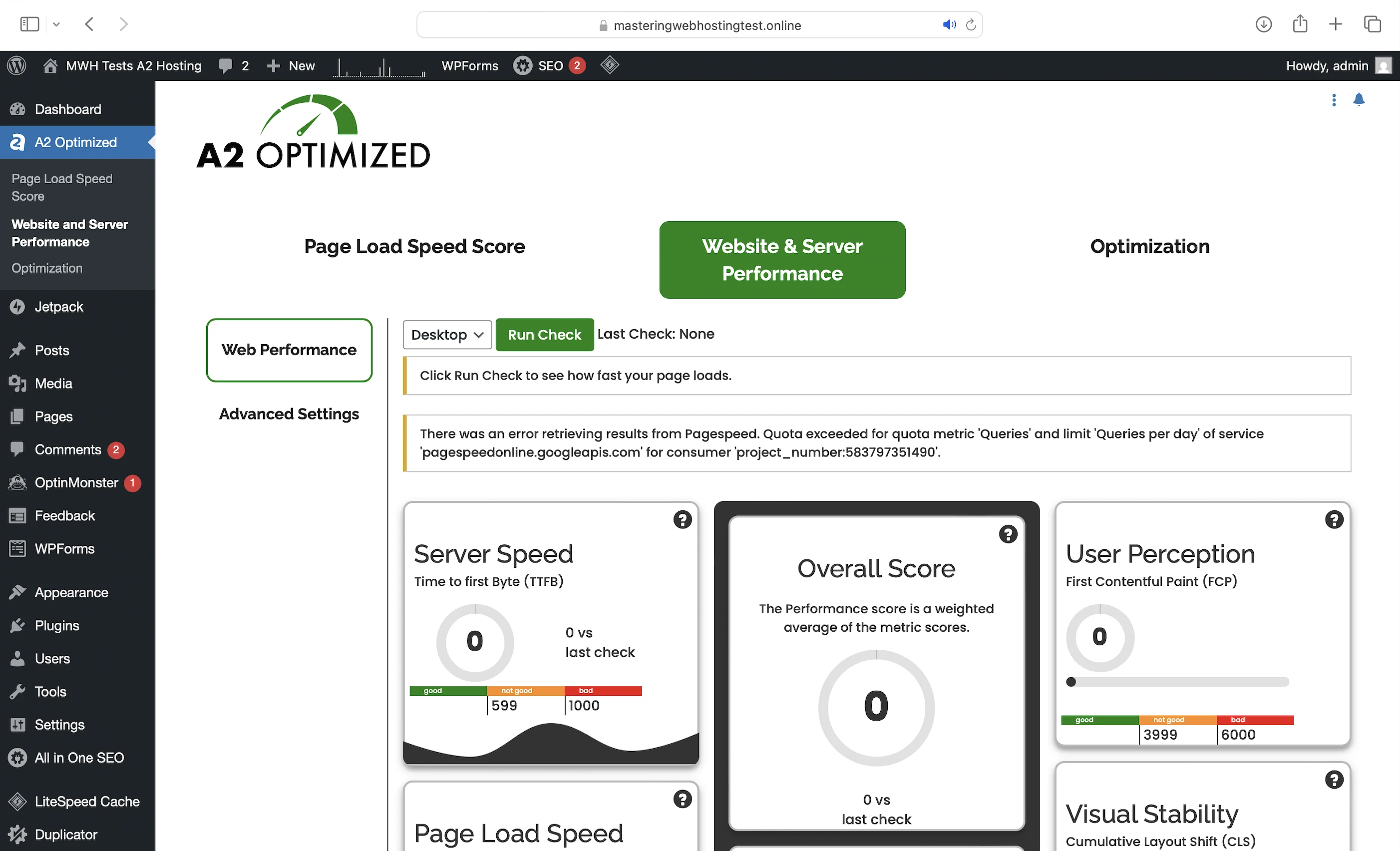 Note the plugin was supposed to measure my page loading speeds and server performance too, but there’s an issue with the API every time I try it.