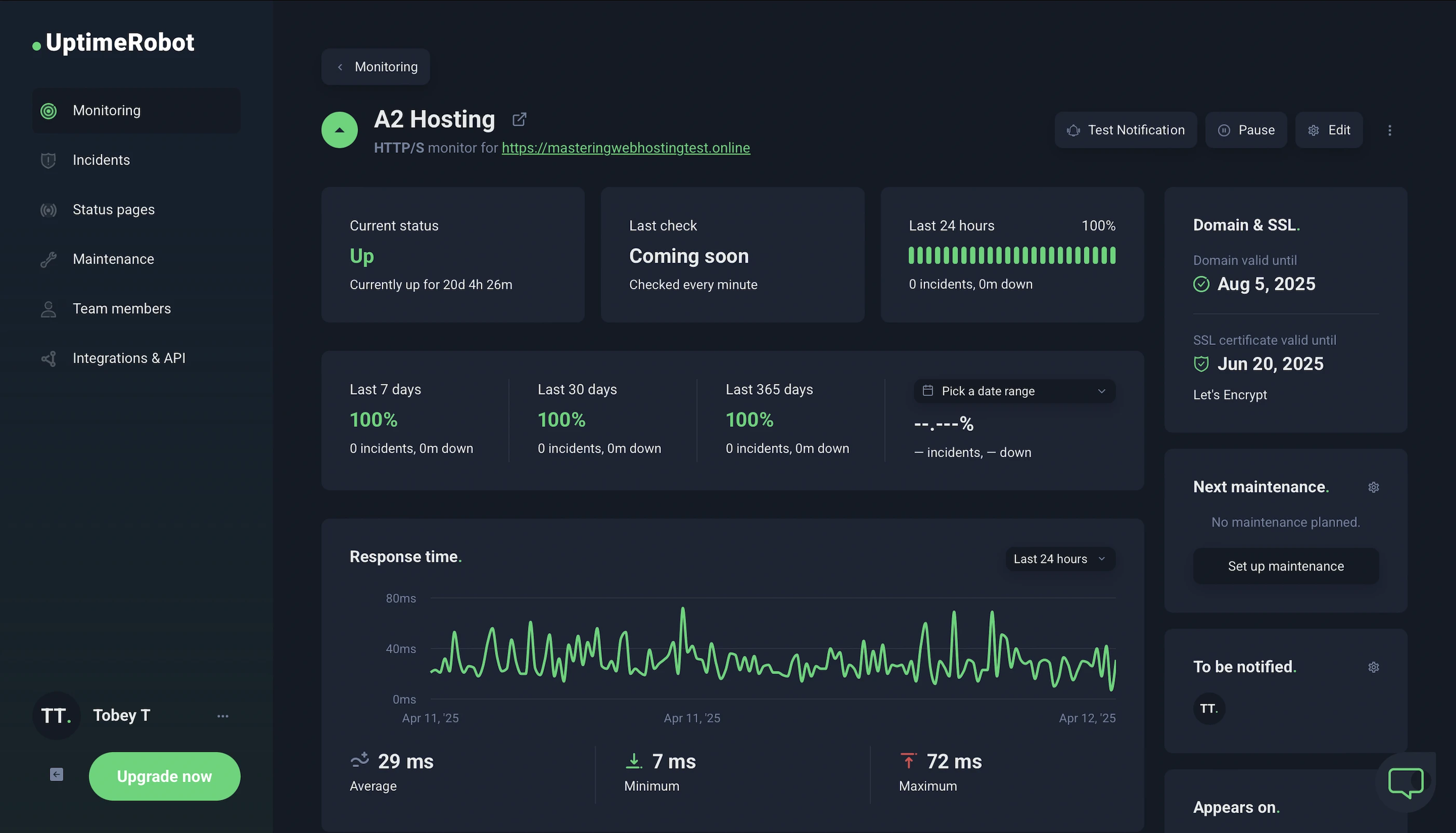 In the 20 days I was reviewing, UptimeRobot reported that my A2 Hosting website enjoyed 100% uptime after checking on it every minute.