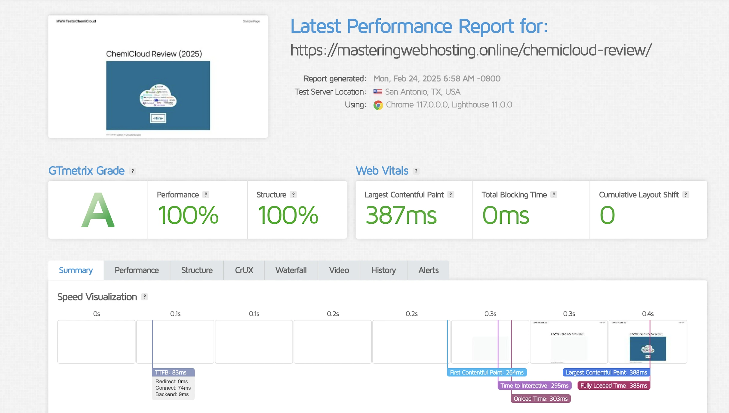 GTmetrix reported a significantly improved LCP of 387ms in Dallas.