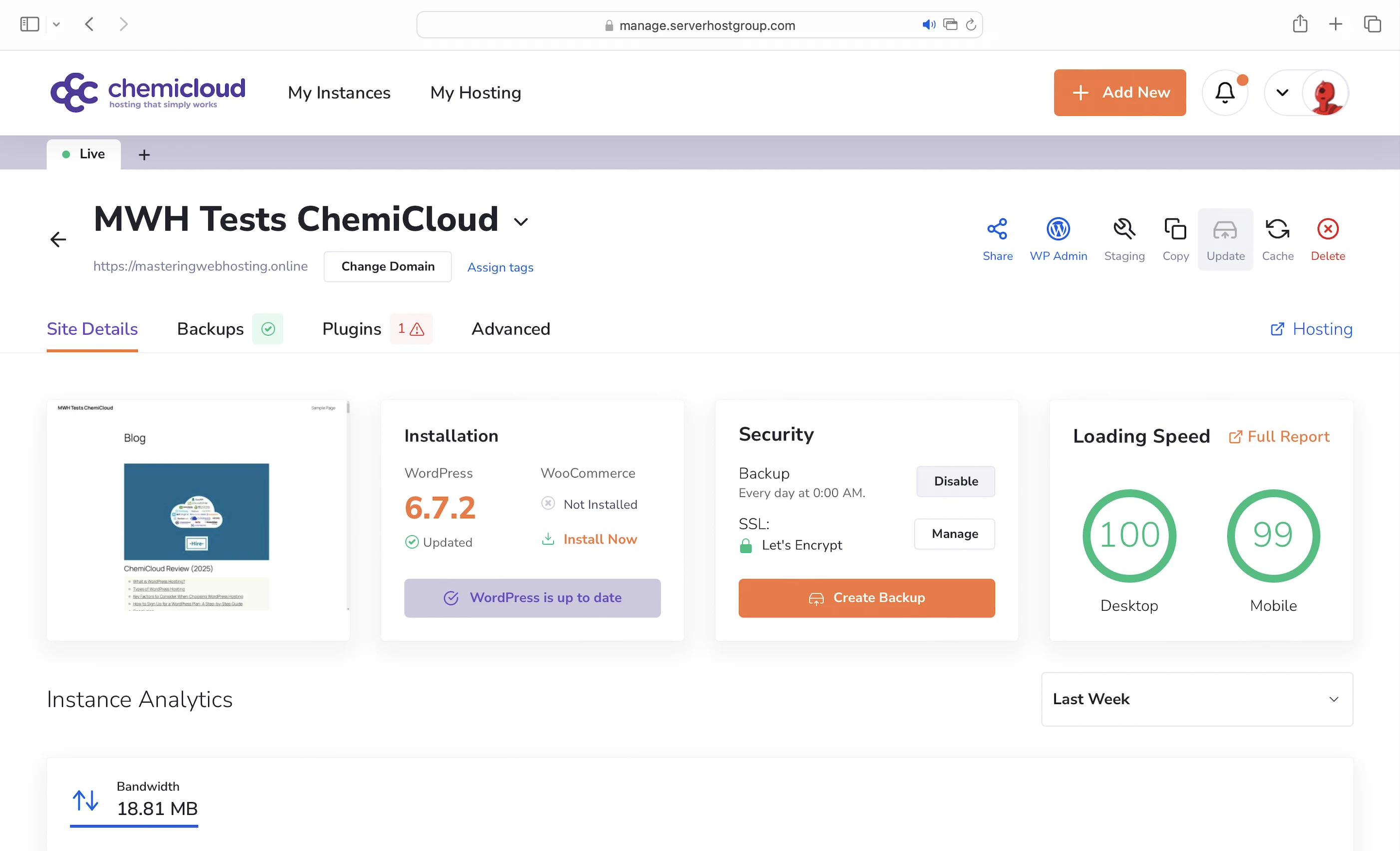 As I briefly mentioned earlier, the MWH1 plan (and the other managed plans) comes with a really cool dashboard that gives you an overview of your WordPress website, lets you configure settings, and shows some performance metrics.