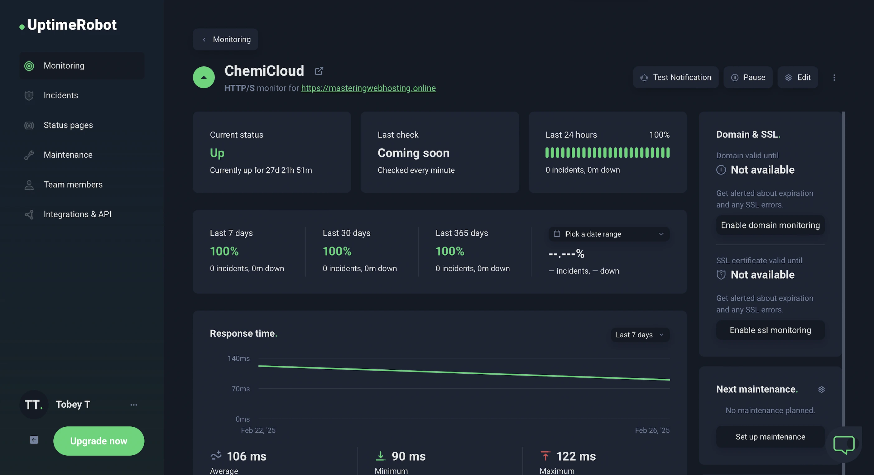 In the 28 days I was reviewing, UptimeRobot reported that my ChemiCloud websites enjoyed 100% uptime after checking on them every minute.