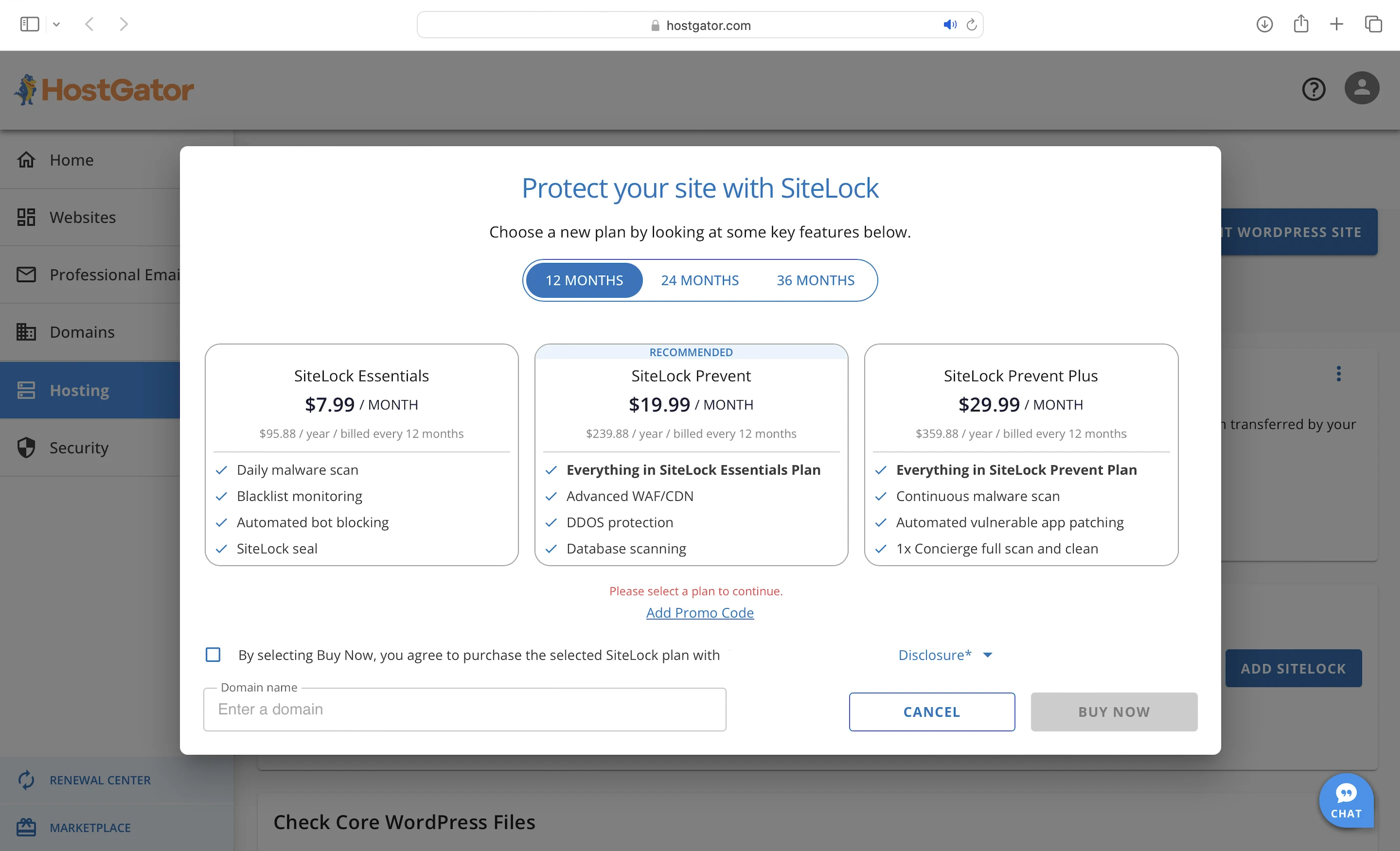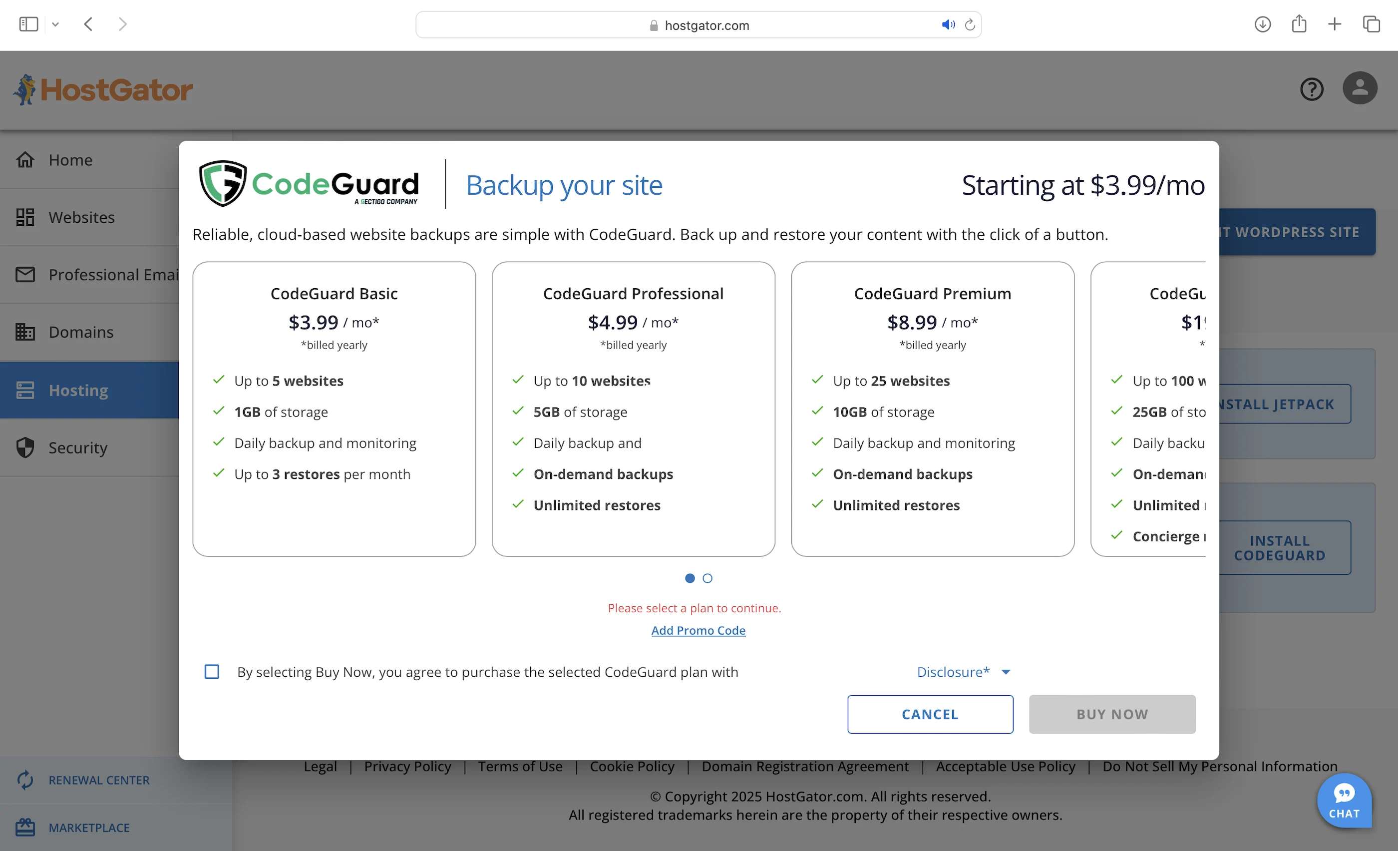 Unlike Bluehost, HostGator only backs up your website if you get its CodeGuard add-on (starting at $3.99/mo), while Bluehost does it for you with a free CodeGuard.