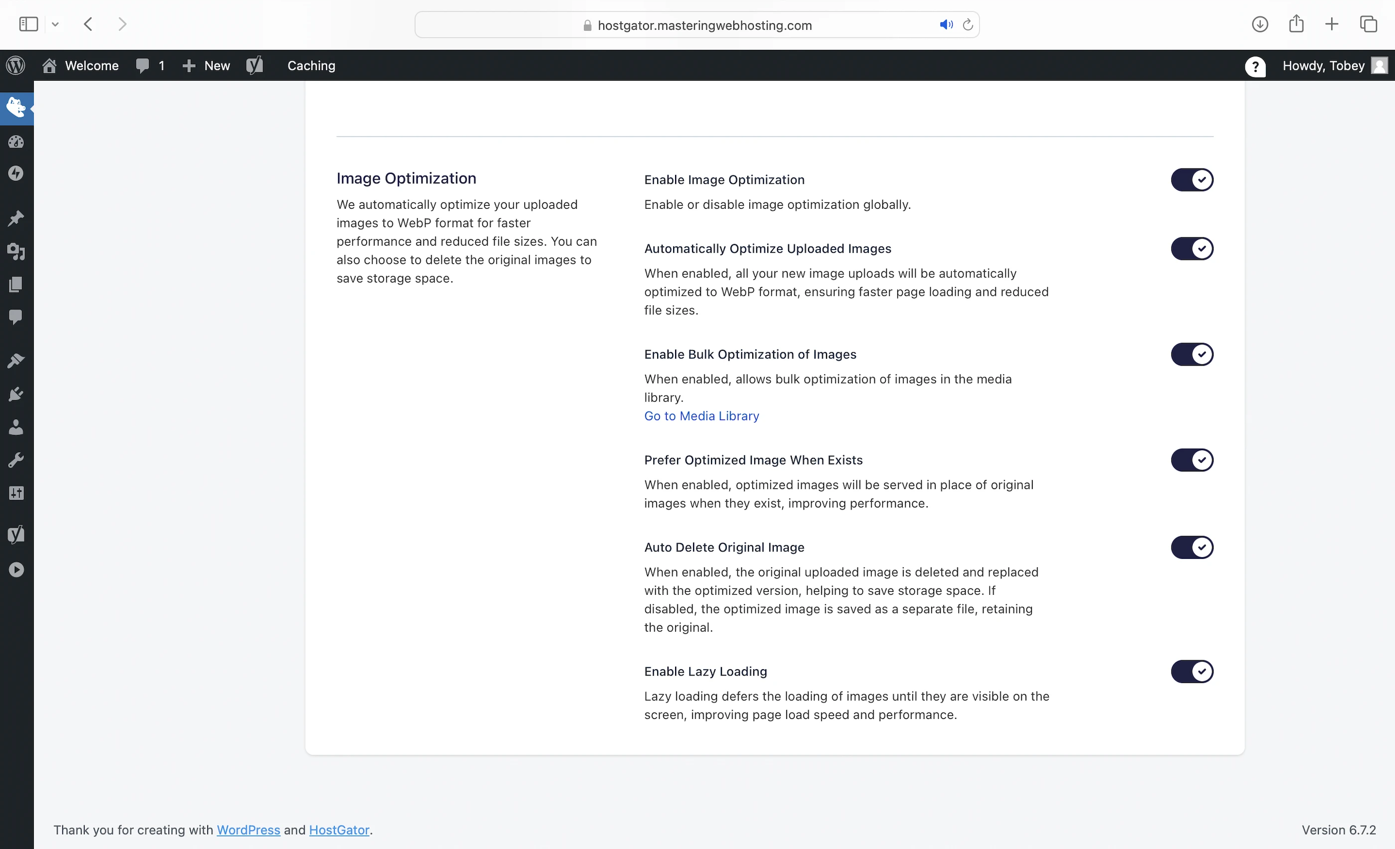 - Image optimization: Compresses your images and converts them to the WebP format, so they load even faster for your visitors.