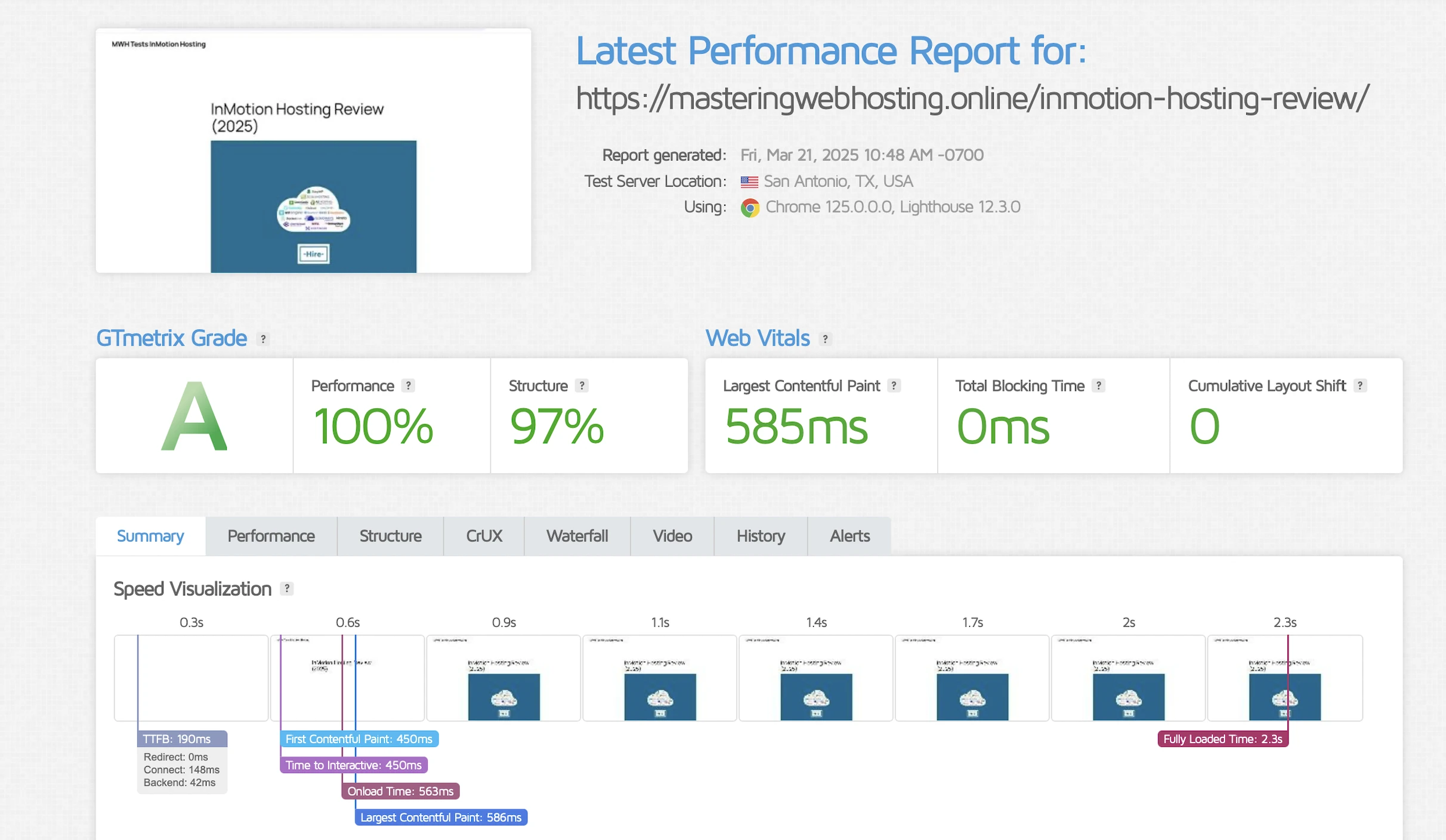 GTMetrix said my Largest Contentful Paint (LCP) was 585ms in Dallas.