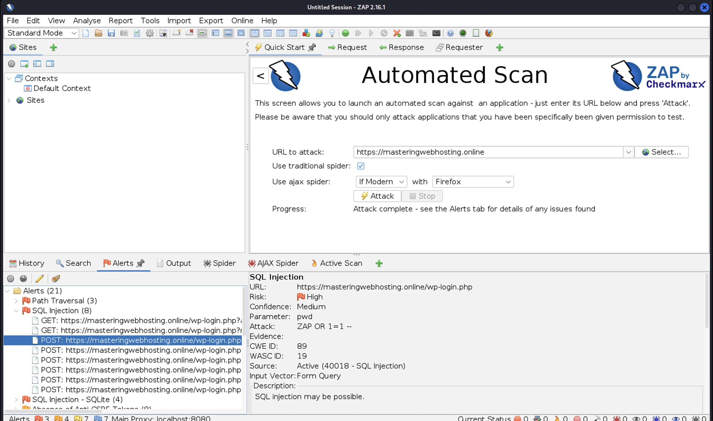 | Security | 0 | 3 high risk vulnerabilities. All SQL Injection vulnerabilities were at my wp-login page! | 3 high risk vulnerabilities. All SQL Injection vulnerabilities were at my wp-login page! |