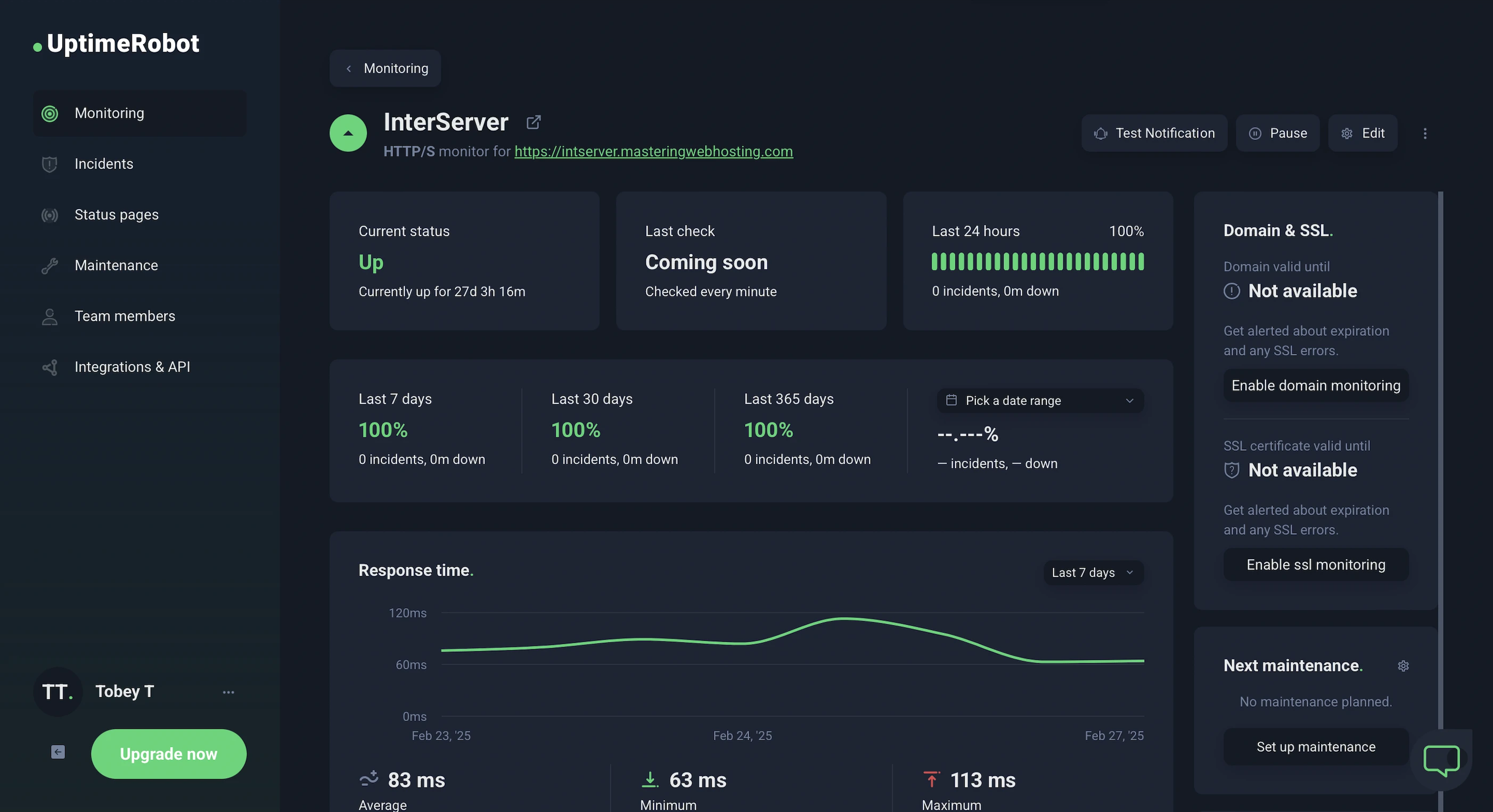 Over 17 days of testing, UptimeRobot reported 100% uptime for my InterServer website, with checks running every minute.