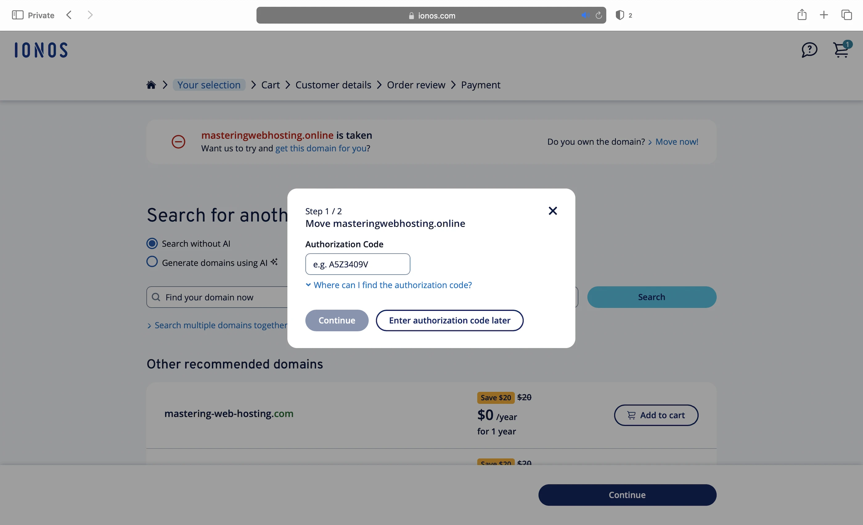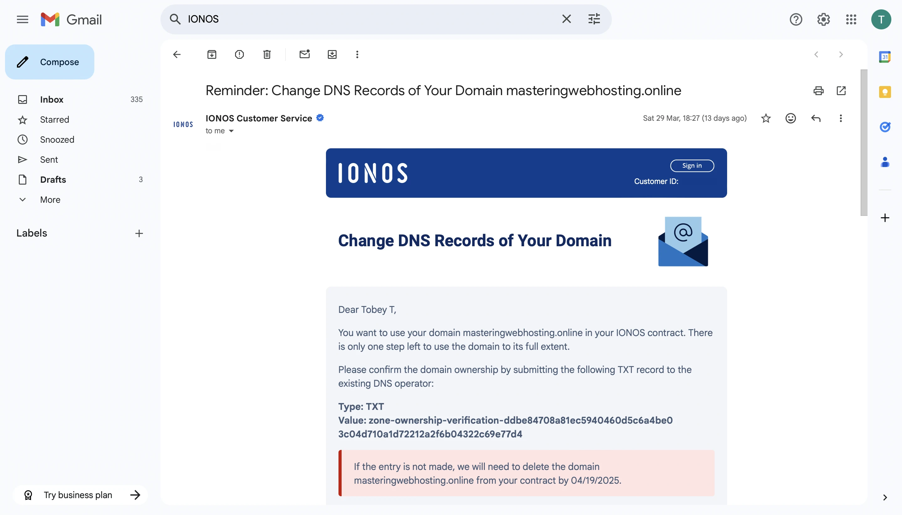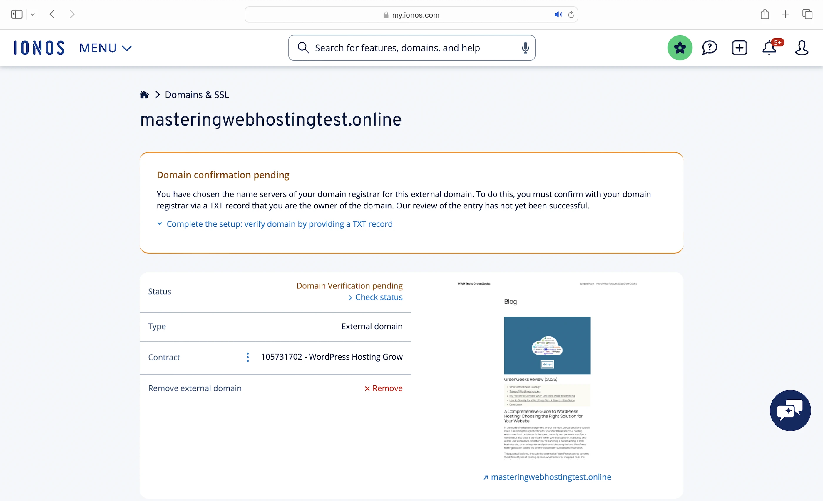 I followed IONOS’ instructions to connect an external domain by adding a TXT record to my DNS, but the verification remained stuck in ‘pending’. I even tried getting another plan to use my Namecheap domain from the start, but IONOS told me I’d need to transfer the domain to them. Wow, no thanks.