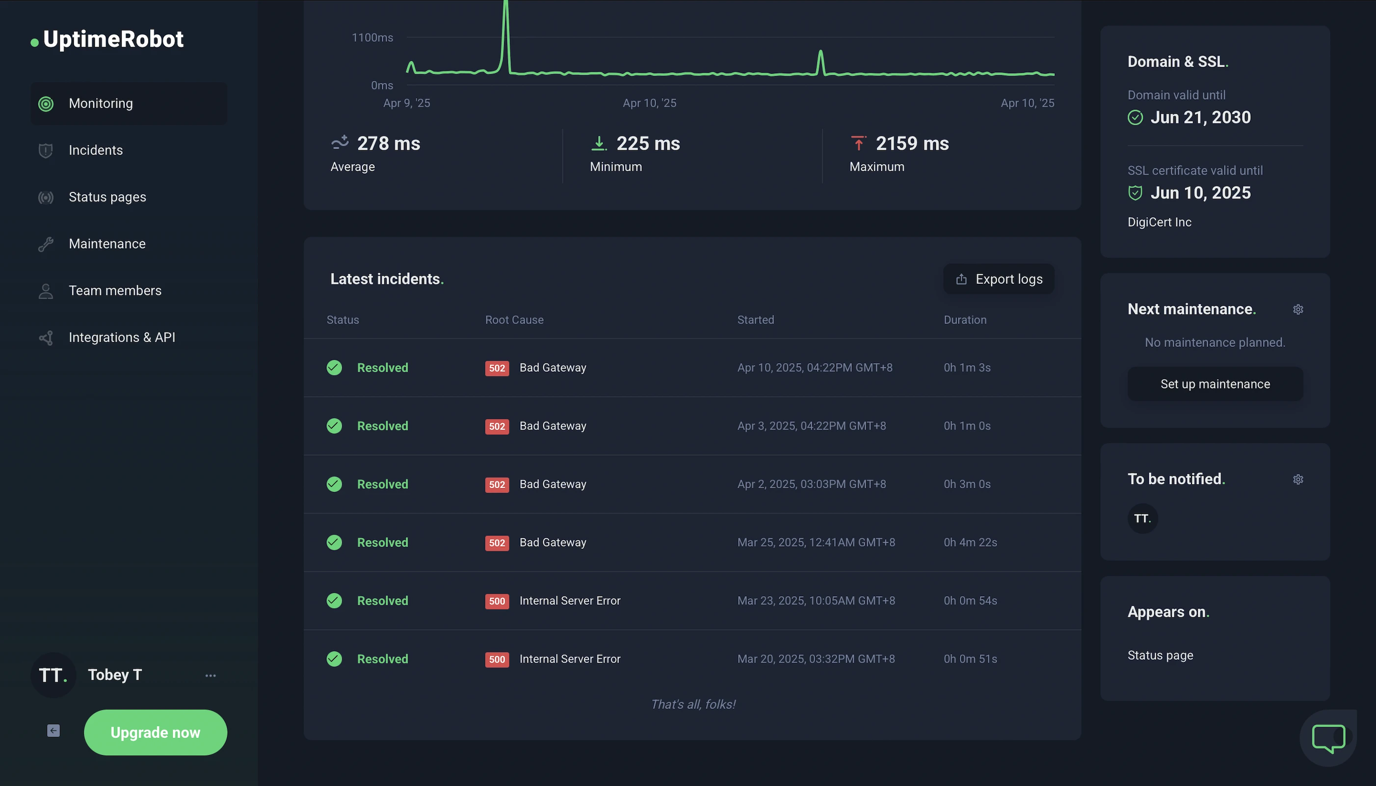However, after monitoring my IONOS website every minute for 20 days, UptimeRobot reported 99.96% uptime with 3 downtimes lasting 6 minutes and 7 seconds.