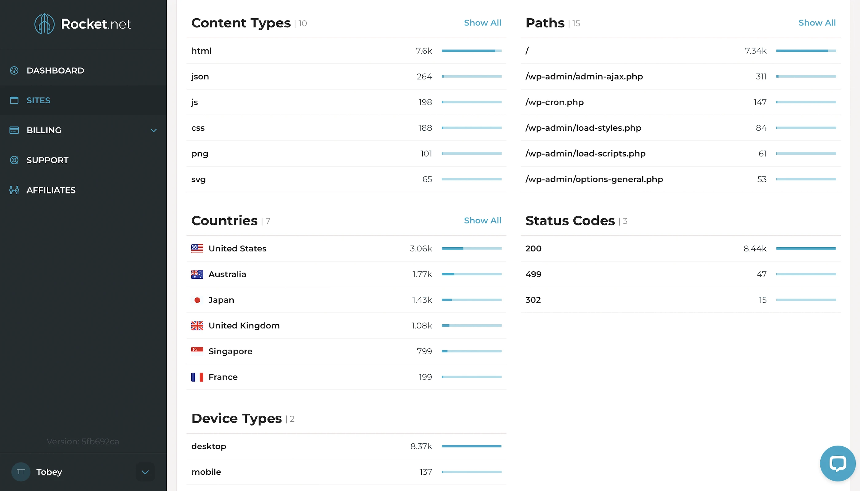 Rocket.net offers insightful details about your traffic like cache performance, countries, and device types. Personally, I find the latter two useful if I want to know I’m reaching the right audience.