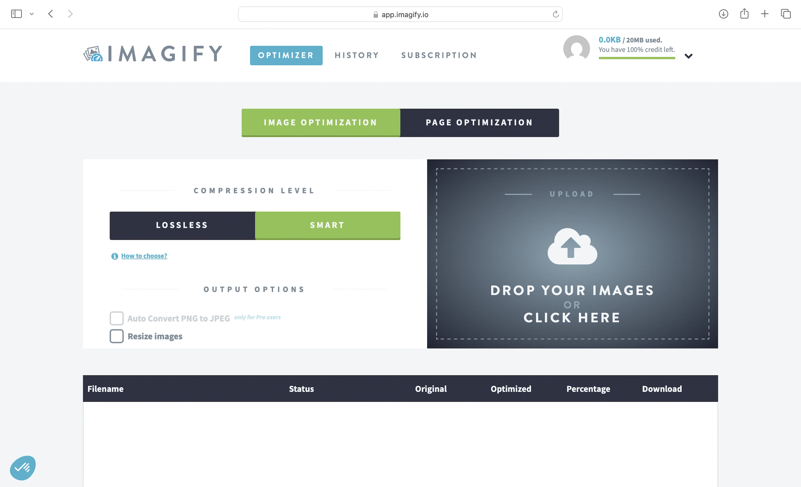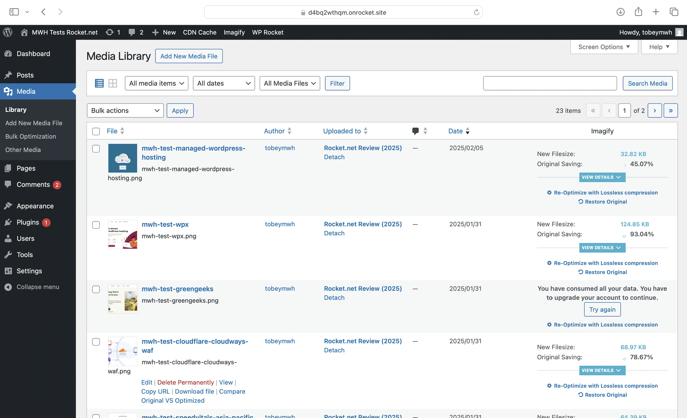 By default, you’ll be on the free plan after installing WP Rocket and setting up Imagify. However, you can only compress and optimize up to 20 MB of images per month, which isn’t much—about half of my 20 images weren’t even converted to WebP. If you need more, you’ll have to upgrade to a paid plan, which starts at $5.99 per month. A workaround is to compress your images yourself before uploading them using free tools like Cloudinary.
