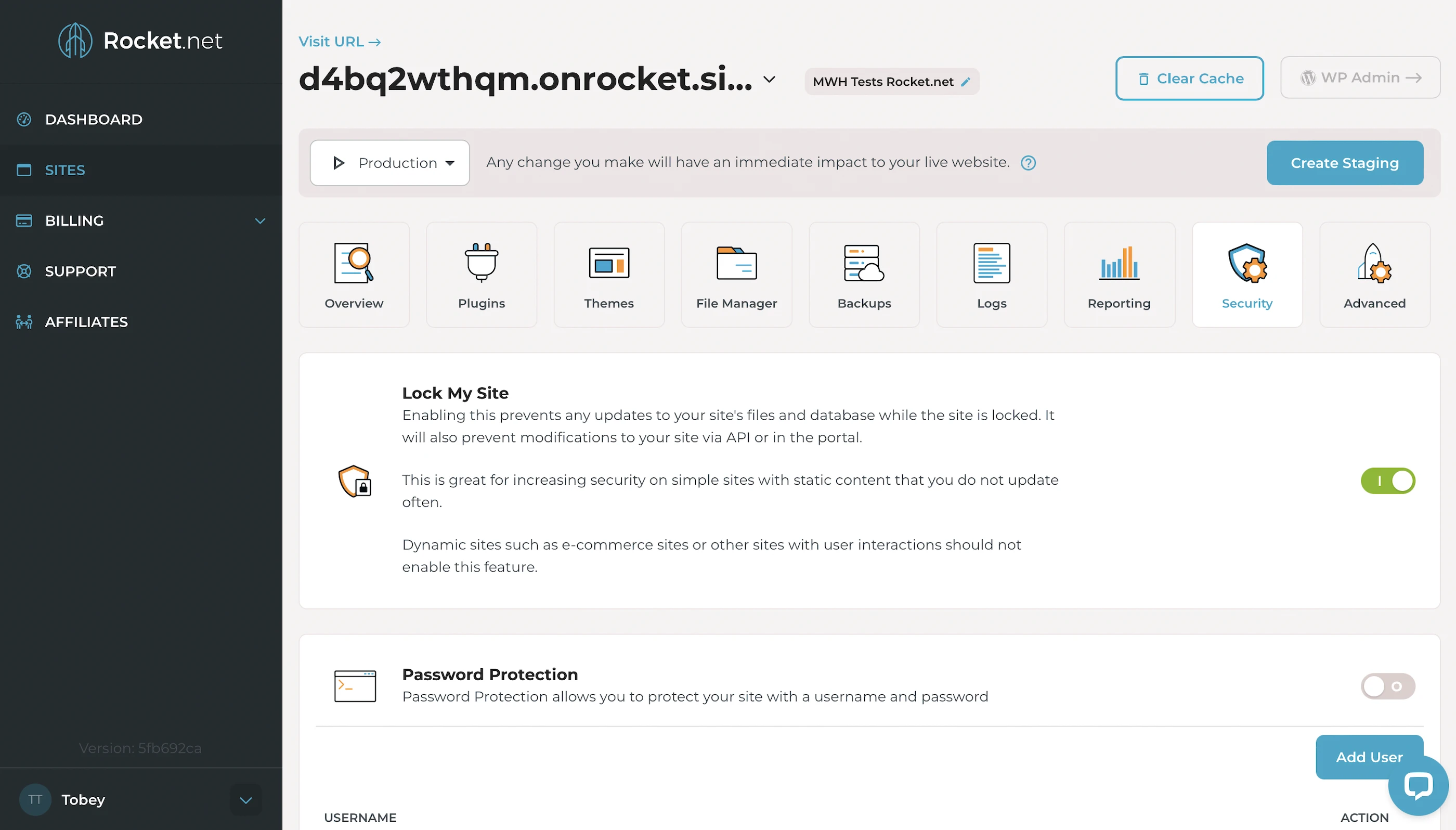 Finally, Rocket.net lets you lock your admin console to prevent unauthorized changes to your website. Even you, the owner, can’t make any changes to it, so remember to unlock this if you want to update your website!