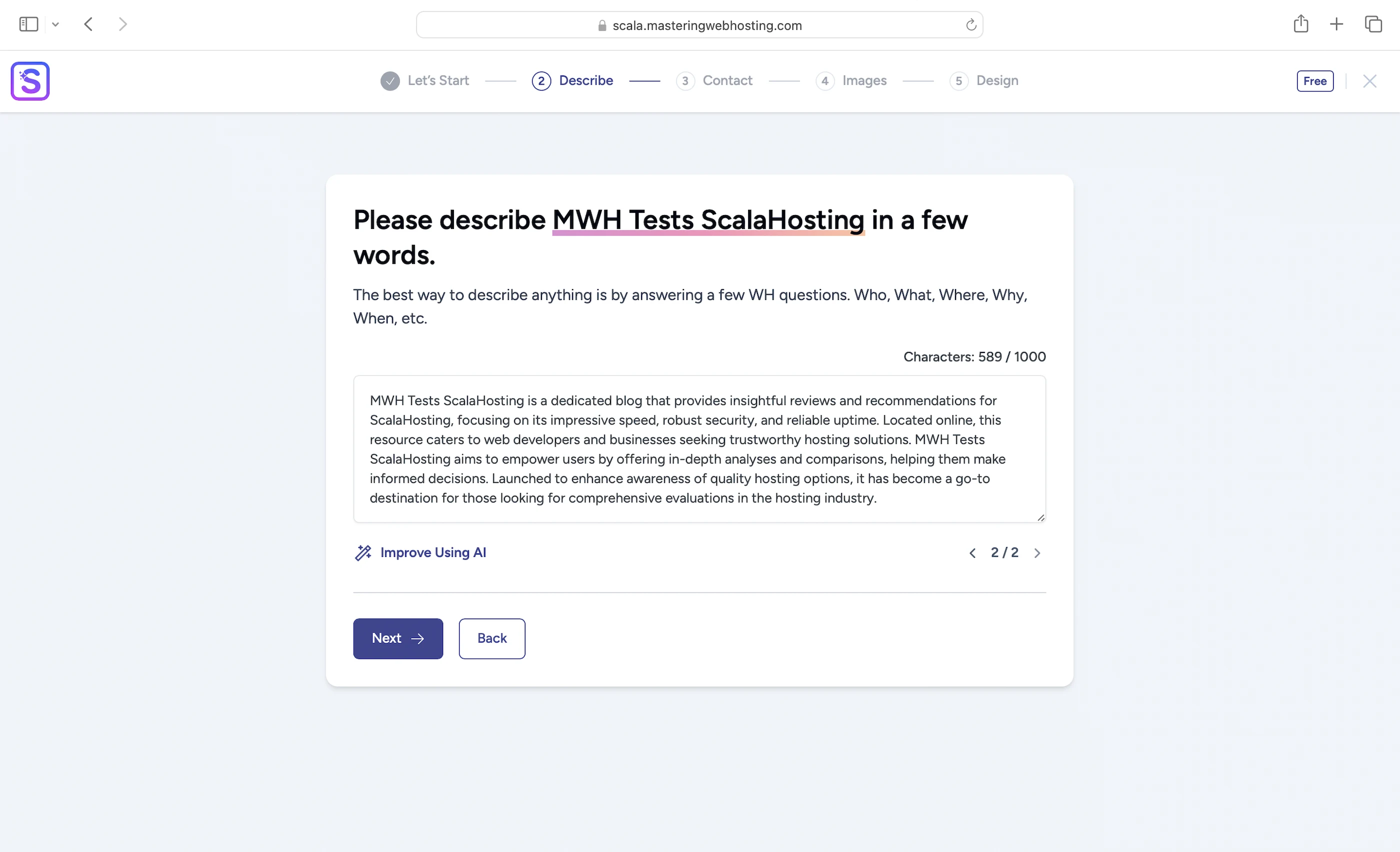 - AI Website Builder: Create a website with a prompt describing what it should be like. Your prompt needs to be detailed or the Builder will ask for more, though the cool thing is that the Builder can improve your prompt with AI too. Personally, I find the generated website slightly better than A2 Hosting’s, though I still prefer Bluehost’s Testimonials. But hey, I am not a UI designer, so do what you will with my opinion.