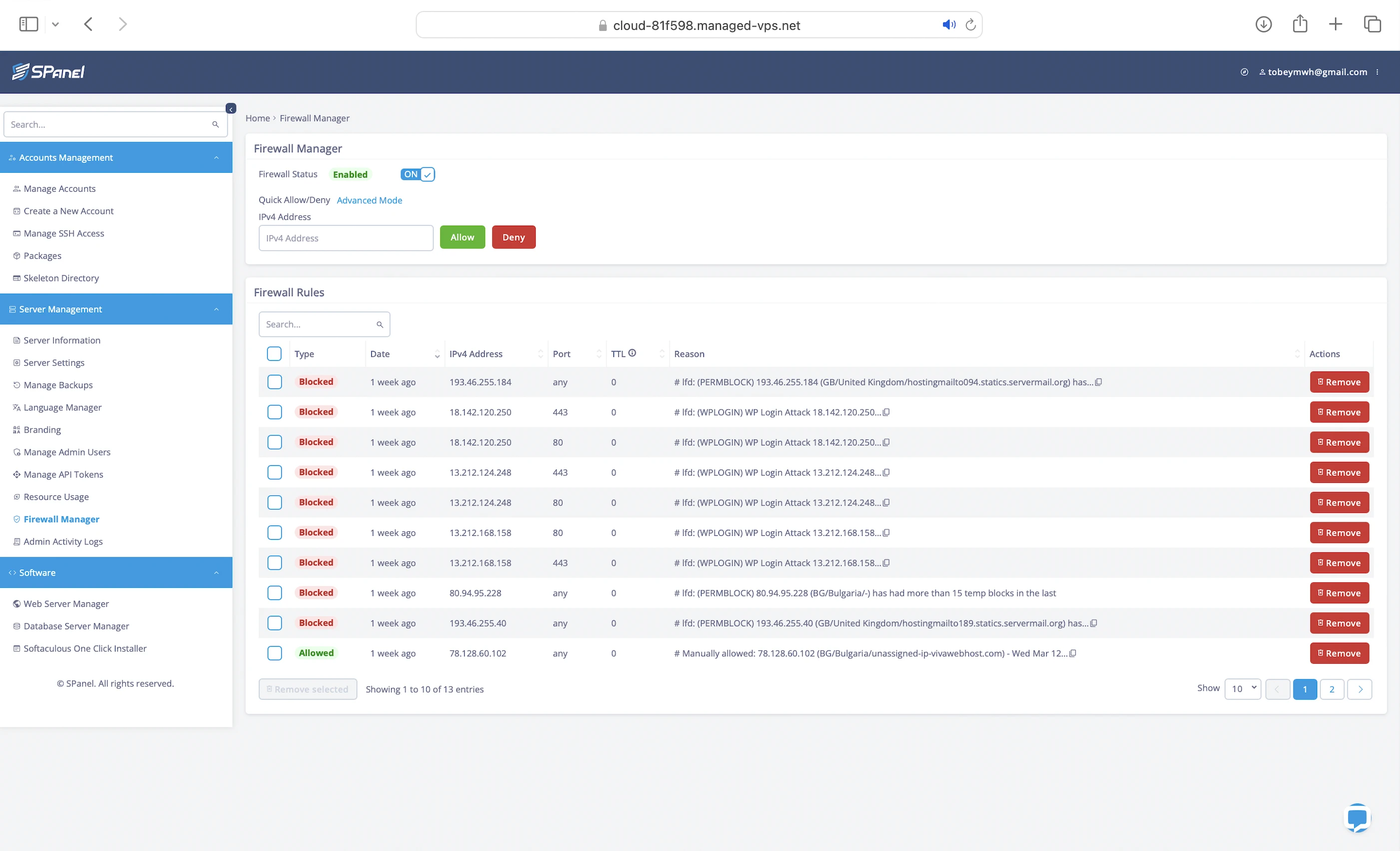 - Dedicated firewall: Actually ConfigServer Firewall. It restricts protocol access to server contents (eg. FTP for files, SMTP for emails) and protects against server-level brute force attacks by blocking suspicious IP addresses with multiple login failures. You can also use the Firewall Manager in SPanel to block them yourself.