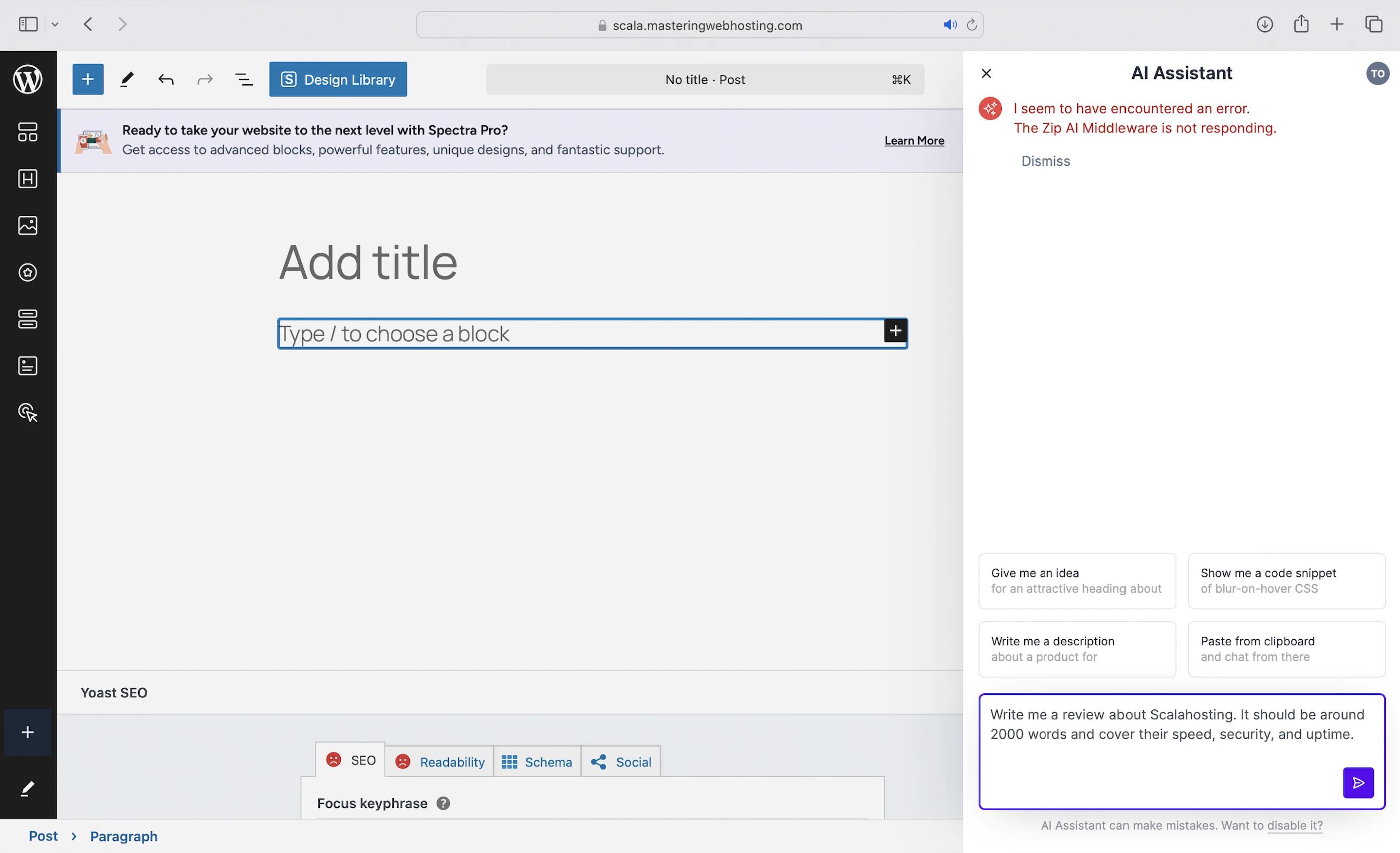 - AI Assistant: You need to sign up with ZipWP first before creating content with a prompt. However, I kept getting an error with ZipWP’s middleware, so I couldn’t test this.