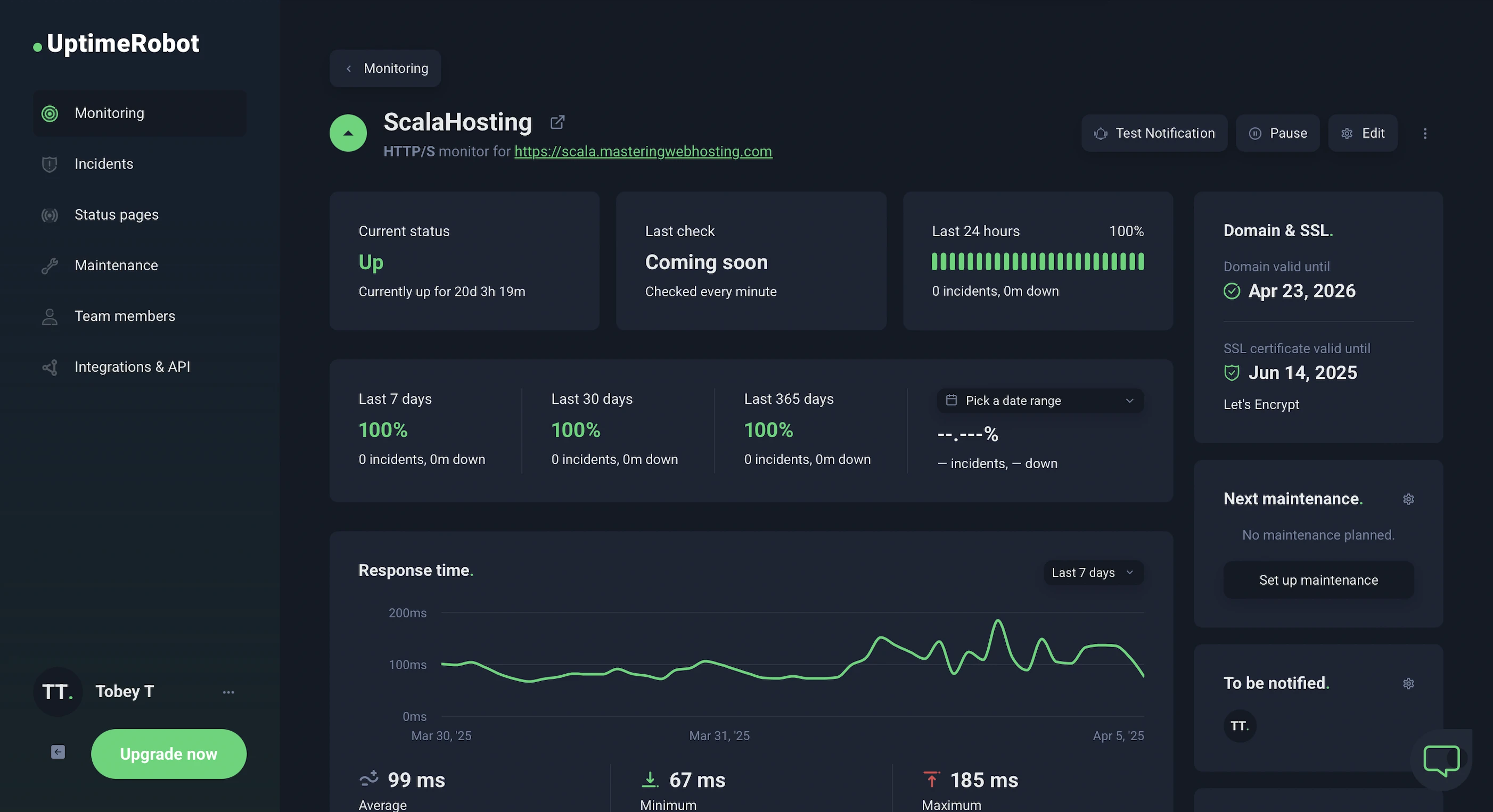 In the 20 days I was reviewing, UptimeRobot reported that my ScalaHosting website enjoyed 100% uptime after checking on it every minute.